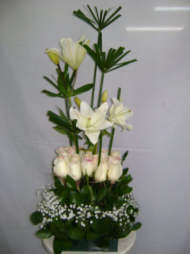 Diseño elaborado en rosas, lirios, gipsophilia, sombrillas chinas. Tamaño foto $120.000