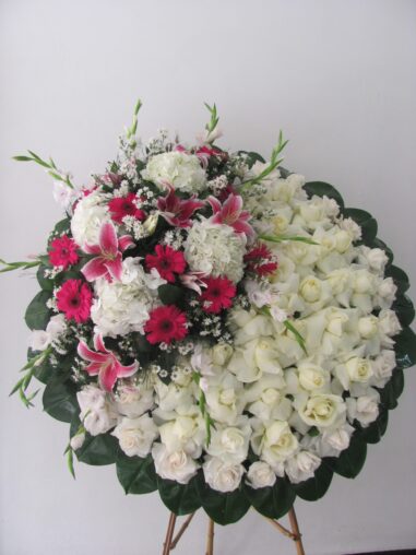 Corona elaborada en Rosas, Lirios, Hortensias, Gerberas, Follajes. Tamaño foto Grande $420.000