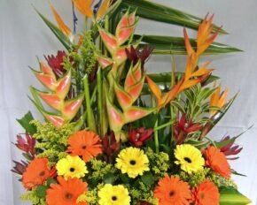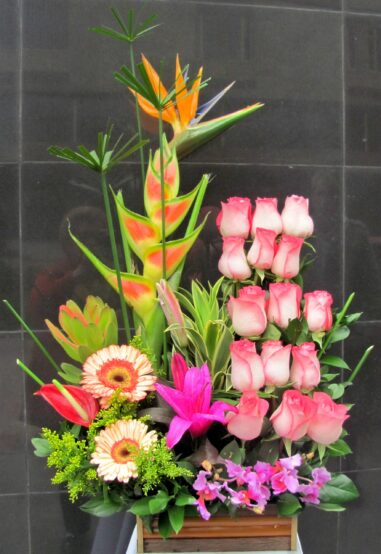 Diseño elaborado en rosas, lírios, gerberas, heliconias, orquídea hawayana, follajes, base madera.  $180.000