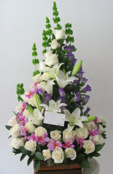 Diseño elaborado en rosas, orquídea hawayana, lírios, campánulas, follajes, base de vidrio.  Tamaño foto  $280.000